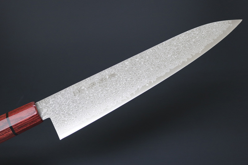 Minamo-kaze is named for the beautiful scenery which occurs in nature when "a pleasant wave pattern is created on a calm water surface by a soft breeze". The blade is 63 layers of damascus w/Japanese high carbon stainless steel core, a high quality material proudly made in Japan. The high grade of razor-sharpness lasts a long time. The handle end is engraved with the Kanetsune Seki brand logo mark "Kumadori". The handles are made of red wood w/black micarta rings. These come in a classy wooden box, showcasing a Japanese tradition.